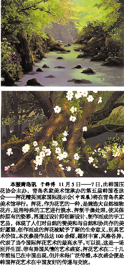 本报青岛讯 于释博 11月5日——7日,由韩国压花协会主办,青岛名家美术馆承办的第五届韩国苍脉会——押花精英画家国际展示会(中国展)将在青岛名家美术馆举行。押花,作为花艺的一种,是摘选大自然植物花卉,运用特殊的工艺进行脱水、押制干燥处理,使其保持原有的姿彩,再通过设计师创新设计、制作而成的手工艺品,体现了人们对自然的赞美和与自然和协共存的美好愿望,创作而成的押花被赋予了新的生命意义,别具艺术价值。本次参展作品达100余幅,题材丰富,风格各异,代表了当今国际押花艺术的最高水平。可以说,这是一场别开生面、带有异国风情的艺术盛宴。押花艺术在二十几年前虽已在中国出现,但并未得广泛传播,本次盛会便是韩国押花艺术在中国友好的传递与交流。