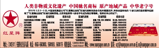 2010年3月2—3日,中国宣纸集团公司“红星精品宣纸”区域代理商洽谈会在杭州隆重召开,来自全国各地的13家文房四宝经营单位获得了“红星精品宣纸”区域代理商资格,北京荣宝斋等4家老字号成为指定零售商。现将名单公布如下: