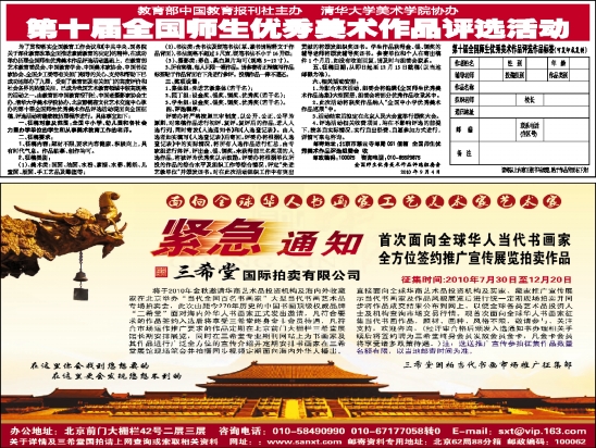 为了贯彻落实全国教育工作会议和《中共中央、国务院关于深化教育改革全面推进素质教育的决定》的精神,在成功举办历届全国师生优秀美术作品评选活动基础上,在教育部艺术教育委员会、中国教育学会、中国美术家协会、中国书法家协会、全国少工委等有关部门领导的关心、支持和帮助下已成功地举办了九届,受到了教育部及有关部门的高度评价和社会各界的热情关注,已成为我国艺术教育领域中较高规格的活动之一。由教育部中国教育报刊社、中国老摄影家协会主办,清华大学美术学院协办,北京静鹤斋文化艺术交流中心承办的第十届全国师生优秀美术作品评选活动现面向全国征稿,评选活动将继续按历届程序进行。具体事宜如下: