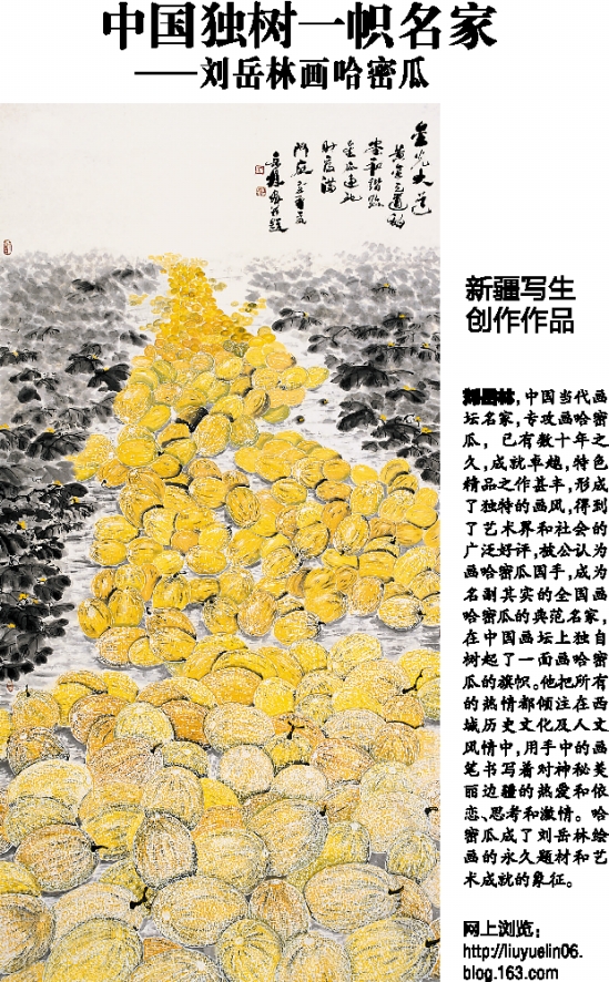 刘岳林,中国当代画坛名家,专攻画哈密瓜,已有数十年之久,成就卓越,特色精品之作甚丰,形成了独特的画风,得到了艺术界和社会的广泛好评,被公认为画哈密瓜国手,成为名副其实的全国画哈密瓜的典范名家,在中国画坛上独自树起了一面画哈密瓜的旗帜。他把所有的热情都倾注在西域历史文化及人文风情中,用手中的画笔书写着对神秘美丽边疆的热爱和依恋、思考和激情。哈密瓜成了刘岳林绘画的永久题材和艺术成就的象征。