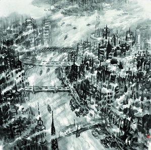 一方水土,造就一方人才,高楼林立的香港造就了王秋童。在艺术家身上,艺术境界和人生境界向来都是相为印证的。在王秋童水墨画中追求凸显的当今都市的壮美精神,正是他人格精神的写照。他的画就像他的为人:真诚、朴实、平易、宽厚、坚毅、善良,不慕浮华、不喜张扬。在他身上,真挚的感情主宰着通达的理性,内在的性情包孕着拼搏和顽强,脚踏实地地进取常凭着对悠久的历史的感怀。应该说,他这种主体人格的理想和自由精神,是通过大都市的形象感受来呈现的。他的人生感喟是通过气势磅礴、壮丽无比的大都市来彰显的。所以他在都市水墨系列创作中追求大美、壮美!他把物象转化为心象,心象迹化为形式,在形式中注入了生命,变成生命的回声。他的每幅画都是一个新生命的诞生,与“道法自然”、“天人合一”有了机缘,真正开启了艺术的天机,与大中国、大画风有了某种延续性的联结,这也是对传统文化精神的真正继承。