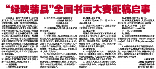 为进一步展示蒲县绿化取得的新成就,现举办首届“绿映蒲县”全国书画大赛,作品征集相关事宜说明如下:
