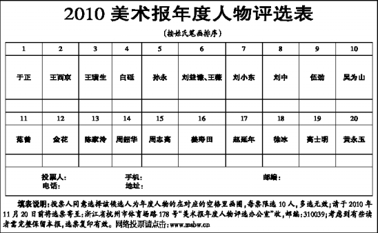填表说明:投票人同意选择该候选人为年度人物的在对应的空格里画圈,每票限选10人,多选无效;请于2010年11月20日前将选票寄至:浙江省杭州市体育场路178号“美术报年度人物评选办公室”收,邮编:310039;考虑到有些读者需完整保留本报,选票复印有效。网络投票请点击:www.msbw.cn