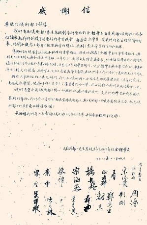 近20位学员齐撰感谢信,并亲笔签名。他们写道:“我们首届《美术报》书法高级创作研修班全体学员,首先感谢《美术报》的各位领导为我们创造了这么好的学习机会,通过这次学习,使我们的书法理论清晰起来,认识和观念上都有了脱胎换骨的变化,找到了书法学习的方向和目标。导师们的现场书法示范和精辟的书学论述,极大地激发了全体学员的学习积极性,使全体学员通过学习训练,专业水平有了较大的提高。通过这次学习,使我们的人生添上了浓墨重彩的一笔,这必将影响我们今后的艺术人生。我们希望今后《美术报》能一如继往地关心爱护我们,为我们的学习和成长提高长期的帮助,我们将以实际行动来宣传《美术报》,为《美术报》的发展尽绵薄之力。祝愿《美术报》的事业更加辉煌灿烂。”