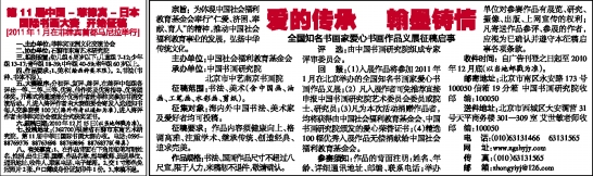 回 报:(1)入展作品将参加2011年1月在北京举办的全国知名书画家爱心书画作品义展;(2)凡入展作者可免推荐直接申报中国书画研究院艺术委员会委员或院士、研究员;(3)凡为本次活动捐赠作品者,均将获得由中国社会福利教育基金会、中国书画研究院颁发的爱心荣誉证书;(4)精选100幅优秀入展作品无偿捐献给中国社会福利教育基金会。