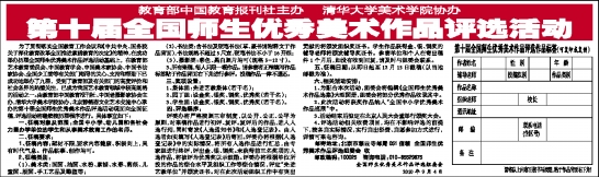 为了贯彻落实全国教育工作会议和《中共中央、国务院关于深化教育改革全面推进素质教育的决定》的精神,在成功举办历届全国师生优秀美术作品评选活动基础上,在教育部艺术教育委员会、中国教育学会、中国美术家协会、中国书法家协会、全国少工委等有关部门领导的关心、支持和帮助下已成功地举办了九届,受到了教育部及有关部门的高度评价和社会各界的热情关注,已成为我国艺术教育领域中较高规格的活动之一。由教育部中国教育报刊社、中国老摄影家协会主办,清华大学美术学院协办,北京静鹤斋文化艺术交流中心承办的第十届全国师生优秀美术作品评选活动现面向全国征稿,评选活动将继续按历届程序进行。具体事宜如下: