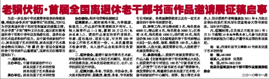 六、征稿时间:自见报之日起至2011年1月31日截稿(以当地邮戳为准),凡参与此次活动的书画家视为已确认并遵守本启事的各项规定。