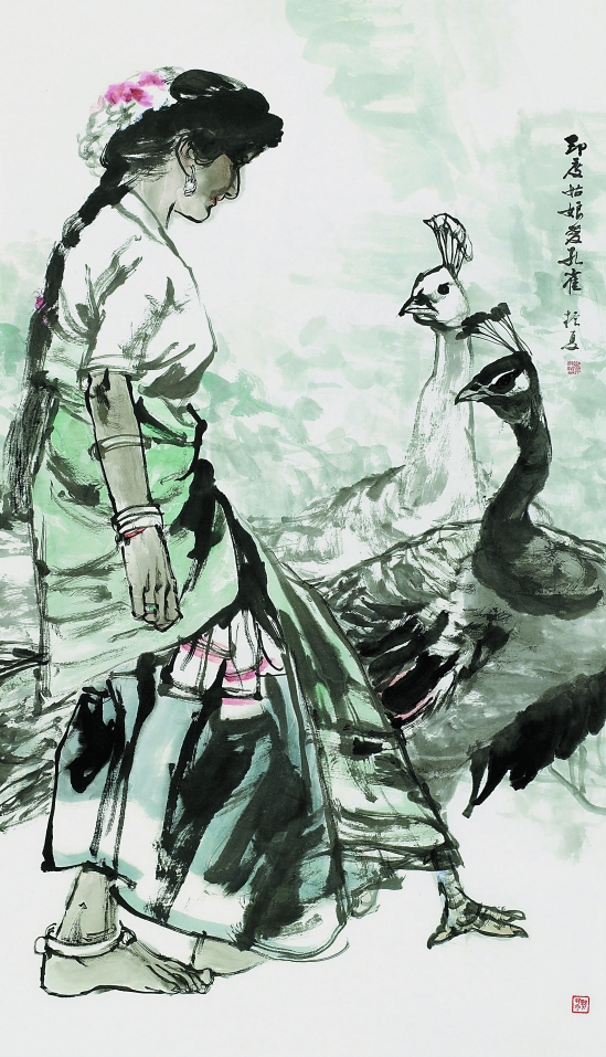 刘振夏 印度姑娘爱孔雀 166×97cm