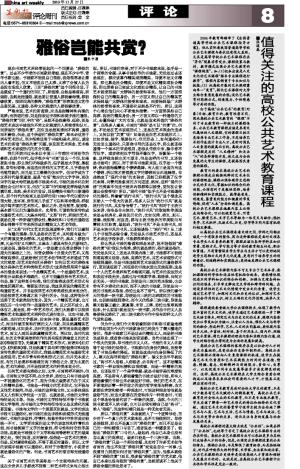 严格来说,艺术的所谓雅,应当是指精神和内涵的高雅;而所谓的俗,则是指表达手段和表现手法的通俗。“雅俗共赏”词汇中的“俗”,显然不是指庸俗、低俗,而是指艺术表达手法能为不同文化程度的人所接受和认可。而所谓的“雅俗共赏”,则应当是指高雅而不高深,通俗而不庸俗。但是,这个所谓的“雅俗共赏”,却未必适用于所有艺术形式,至少很难适用于书法和美术。所以,谈论艺术的所谓“雅俗共赏”问题,涉及到艺术理念、艺术格调和艺术表现形式的区分问题。
