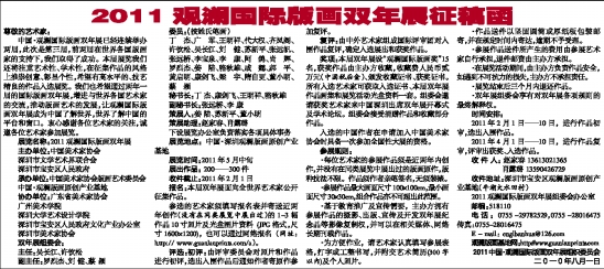 中国·观澜国际版画双年展已经连续举办两届,此次是第三届,前两届在世界各国版画家的支持下,我们取得了成功。本届展览我们还将注重艺术性、学术性,在征集作品的风格上推崇创意、彰显个性,希望有高水平的、技艺精良的作品入选展览。我们也希望通过两年一届的国际版画双年展,增进与世界各国艺术家的交流,推动版画艺术的发展,让观澜国际版画双年展成为中国了解世界,世界了解中国的平台和窗口。衷心感谢各位艺术家的关注,诚邀各位艺术家参加展览。