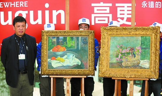 | 11月19日,台北美术馆为“永远的他乡——高更”大型高更作品展举行记者会。展览于11月27日在台北美术馆开幕,预计展出86件高更以及当时受其启发与影响的16位艺术家的作品。图为高更作品《水果盘与柠檬》(左)与《篮中的松叶玫瑰》亮相记者会。 |