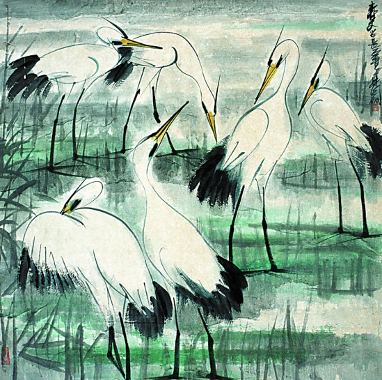 林风眠 群鹭 设色纸本 立轴 70×70cm