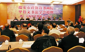 11月19日,浙江省瑞安市政协诗书画院甲骨文书法学会授牌暨《玉海甲骨墨缘》首发式,在瑞安钱塘阳光假日酒店阳光厅举行。瑞安市政协主席白一帆,市委常委宣传部部长黄益友、人大常委会副主任江小娜、江苏省甲骨文学会会长徐自学、浙江省甲骨文书法学会副会长韩天雍、副秘书长柳晓康到会指导,温州市有关县市区政协和政协诗书画院的领导,市宣传部,文化广电新闻出版局、文联等有关部门单位领导,兄弟协会负责人及全体会员一百多人出席会议。会议紧凑、隆重,自始而终充满着热情洋溢的气氛。