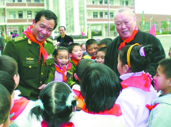 名誉校长尉天池(右)、校外辅导员丁晓兵(左)与孩子们亲切交流。