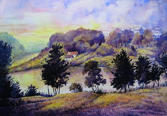 苏学刚(安徽来安) 鱼塘人家 水彩画