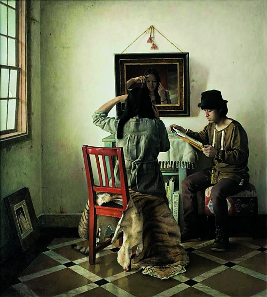 ▲谢郴安的作品《镜中女孩》借用了十七世纪荷兰小画派尤其是维米尔的图式和技巧,但在内容上呈现的却完全是当代年轻人的生活趣味。虽然是借用,但技巧和内容达到了高度的统一,圆满融通,丝毫不显斧凿痕迹。这在当下众多心态浮躁、生搬硬套的当代作品中,显得尤其难能可贵。值得一提的是,这位80后的年轻人在古典油画技法上已经达到相当的水准,这在国内是极为罕见的。