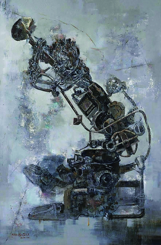 ▲黄明秋的作品《世纪乐章》属于观念图像的类型,但增强了绘画感和情绪因素。在此方向上,石冲和冷军等一批以超级写实主义为主要风格特征的油画家做过大量有益的尝试;但黄明秋的作品更注重画面的内部逻辑,观念图像在这里只是一个绘画性表达的藉口。在观念艺术日渐沦为空洞说教的当下,观念图像向绘画性的回归无疑是大势所趋。黄明秋的作品正是这个趋向的代表。