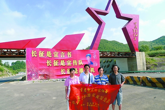 四位画家在贵州茅台镇红军长征宣传碑前合影