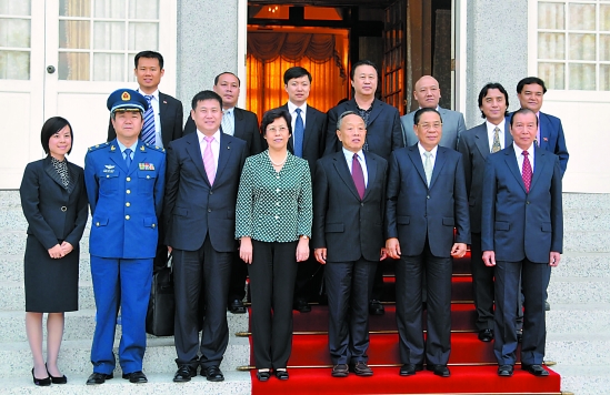2010年12月15日,老挝国家主席朱马里·赛雅贡(前排右二)在主席府亲切接见“和平之旅”中国著名美术家代表团一行。团长李肇星(前排右三)、秘书长邵常淳(前排左三)、艺术总监王界山(前排左二)、画家刘孔喜(后排右二)、画家郑艺(后排右三)、画家刘声雨(后排右四)、中国外交部秘书王德鑫(后排左三)。