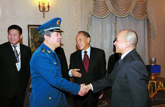 2010年12月13日下午,柬埔寨国王西哈莫尼在皇宫接见代表团艺术总监、中国著名军旅画家王界山等。