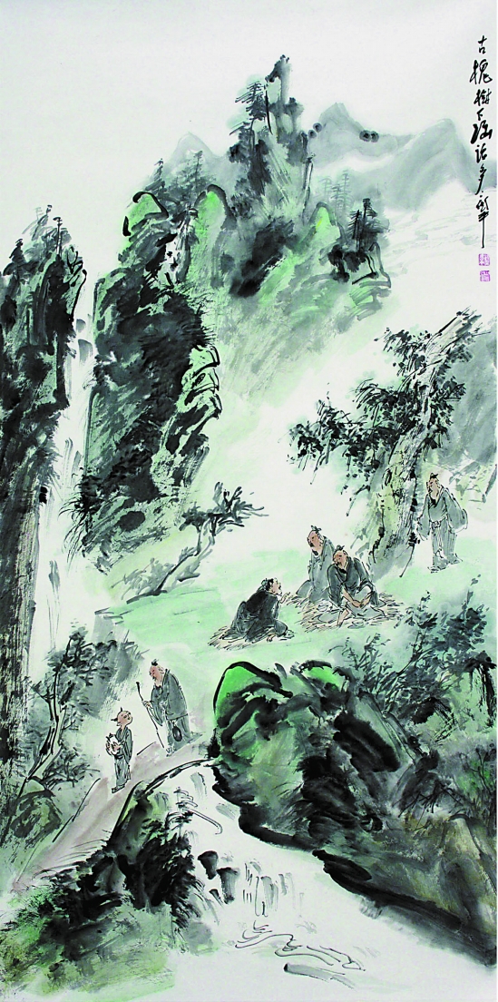 顾平 古槐树下酒话多 136×68cm 南京药艺术馆收藏