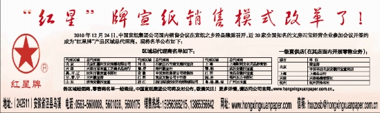 2010年12月24日,中国宣纸集团公司国内销售会议在宣纸之乡泾县隆重召开,近20家全国知名的文房四宝经营企业参加会议并签约成为“红星牌”产品区域总代理商。现将名单公布如下: