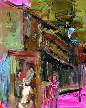 某日,我在枫杨桥上画对面的二层古茶楼,楼下是饭馆,楼上是一茶楼,楼底是河流,由于古镇特有的建筑特色,在桥上可以清楚阅读楼上喝茶与聊天的人,楼下的主人在吊脚楼上忙忙碌碌,还有人在茶楼上垂钓的情形。形式感一下产生了,脑子里突然有了清晰的画面。以前也常来往于这桥上,却未曾发现这样的形式美,这时才仿佛理解了德国画家里希特所言:“艺术没有创造,只有发现。”然而,更为惊奇的发现还发生在我写生的过程中:我正画得兴起,一群小朋友放学从此经过,他们自然要来围观,一位叫韩迟的小朋友拿出他刚画的铅笔涂鸦式的人物画给我看,说是要给我当老师,我听到此话心里为之一震,敬畏之心油然而生。马上恭敬地接过他的画,看到他寥寥几笔在一张又小又薄的纸上画了一个大大的金刚和一个小小的露着小鸡鸡的男孩,我心里再次为之一震。这时,上里古镇的桥、茶楼、韩迟小朋友的画和我融为一体。我欣赏着韩迟的画,经得他的同意,迅速地把他这两个画上的人物搬到了我的画布上。“韩老师”和他的小朋友哈哈大笑着走了。而我在这过程中似乎又有了新的发现。这是巧合?是天意?它是自然而然产生的,是自然给了我机会,而我把它发现了,逮住了,天心与人心的自然碰撞,而我似乎得到了新的升华。