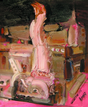 最近画的《节日上里》,我希望在这小小古镇里去发现极端的中国元素,极端的民族精神。我想以充斥极度拓张感的画面,以另类的姿态桀骜地站在丰盈的文化土壤之中,让艺术语言直面生活,在自己的艺术领域上享受着,辗转着,思考着。