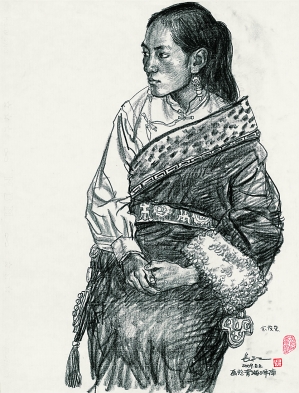 从20世纪90年代初期,你开始把青藏高原行旅采风的大幅素描、彩墨的写生作为自己主要的形式语言,当作品画,当作品展,把大家“习作-创作”的公式改成了你自己的“习作=创作”。从此一发不可收拾,写生的观念加高原的行为,你独往独来,在主义变幻、概念盛行的波澜之中逆流而上,读书行路,执著回返你理想国的精神家园。青藏高原海拔4000米,据说比海平面缺氧40%。你定期往那边跑,倒像是要去吸氧,不去就有生命危险。景仰这片土地上的文明,景仰生存在这里的人,20年如一日,高原之旅成了你执着探索人本生态大河之源的仪式,行礼如仪,你年年回到那片土地去膜拜顶礼、休养生息。记得多年前你也劝我:至少要去身临其境感受一回。神情恳切,有如使徒劝善,要救我出火坑。我明白你画画不是玩,是动真格的,是拼上了身家性命的,就问:什么时候把你自己也画进去?你笑而不答。再问,你说正在找镜子,还抱怨说,“再也找不到老美院U字楼教室那种不变形的老镜子了”。我疑心这是你禅语的机锋。在那些可以听得到心跳的画面上,你是不是已经在众生相的眼睛里“照见”了自己,也早把自己化入天籁之地芸芸众生的眼神之中了?