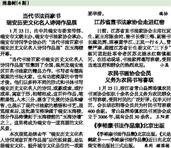 1月25日,浙江省常山县辉埠镇农民书画协会组织十余名会员义务为农民群众书写春联,受到村民的广泛好评。仅半天时间,会长胡志刚等会员共为村民书写春联400余副。 常山县辉埠镇农民书画协会成立于2006年,现有会员30余名。 王阳君