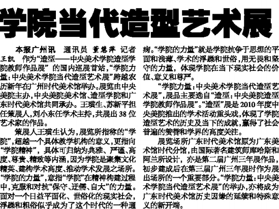 “学院力量:中央美术学院当代造型艺术展”,展品主要选自“造型:中央美院造型学院教师作品展”。“造型”展是2010年度中央美院推出的学术活动重头戏,体现了学院造型艺术的历史及当下的成就,赢得了社会普遍的赞誉和学界的高度关注。