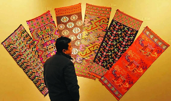 | 2月9日,一位市民在观看土家族织品“西兰卡普”。 春节期间,“楚风楚俗——湖北省非物质文化遗产展览”在湖北省群众艺术馆展出。该馆从2万余件藏品中挑选出200多件实物,集中展示了湖北省最具特色的民间“文物”,使市民有机会了解这些身边的非物质文化遗产。据介绍,目前湖北省共有189个省级非遗项目,其中有两项入选了世界非遗名录。 新华社 程敏 摄 |