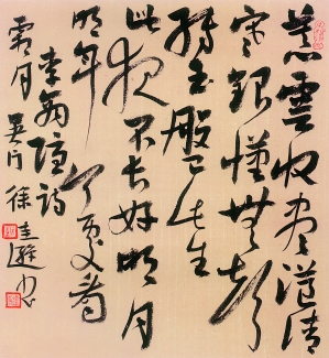 东汉蔡邕在《九势》中曰:“夫书肇于自然,自然既立,阴阳生焉;阴阳既生,形势出矣。”中国的书法艺术始终将阐释“本源性”作为其根本的审美法则,也就是王羲之所言的“书之气必达乎道,同混元之理”。从书法的本质中我们可见动静、刚柔、虚实、舒敛等具象的表现,因此阴阳学说同样贯穿书法理论的评价体系中。书法之博大精深,就在于根植于传统美学的阐释中,行草艺术无疑是书家个性表现的最好载体。从汉代到唐代,几百年的时间,行草书呈现出极具丰富内涵的完美技巧,其本质就是在连续的运动中实现线和空间自由而丰富的变化,在狂草中这种变化还获得一种特质,那就是所有的变化都具有不可预想、不可重现的特质,这使得行草书具有了相当高的难度。徐圭逊呈现给大家的书法作品,以行草书为多。对于徐圭逊的行草书艺术创作而言,其豪放的性情、质朴的线条力度及富有变化的空间分割,找到了抒发自我性情的途径,强调对“度”的把握及“悟”的参透,正是这种对经典的领悟,使得他的创作形成了有别于他人的鲜明书风。