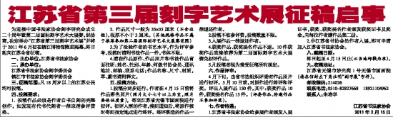 为迎接中国书法家协会刻字研究会成立二十周年暨第二届国际刻字艺术大展赛,经协商,决定举办“江苏省第三届刻字艺术展”并将于2011年6月初在镇江博物馆隆重揭幕。即日起向江苏全省征稿。