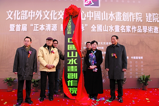 文化部副部长赵少华、文化部外联局局长董建新、文化部中外文化交流中心吕军、创作院院长龙瑞为中国山水画创作院揭牌