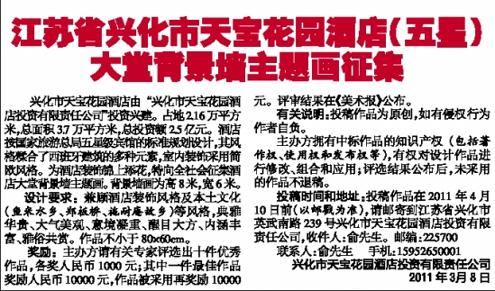 投稿时间和地址:投稿作品在2011年4月10日前(以邮戳为准),请邮寄到江苏省兴化市英武南路239号兴化市天宝花园酒店投资有限责任公司,收件人:俞先生。邮编:225700