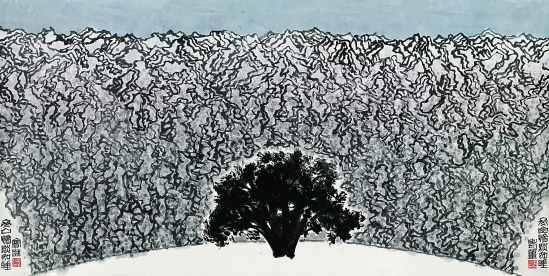 评者曰:圆弧内空白若雪原,天染淡墨衬托白描群山,览之或生空静冬眠之思。