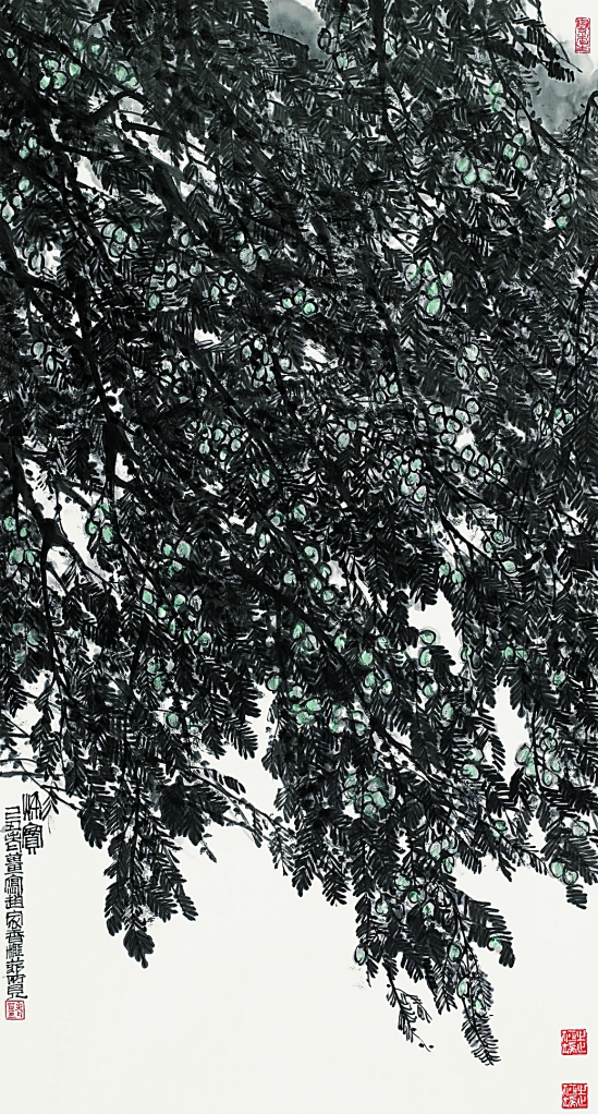 评者曰:画到此纸时,笔墨造型课题已经熟练,故画针叶时枯润自如,加之榧果勾填施绿,遂整体实密而不失局部微妙变化,有密亦通风透气之韵。古画诀称“密不通风”,应与商榷。
