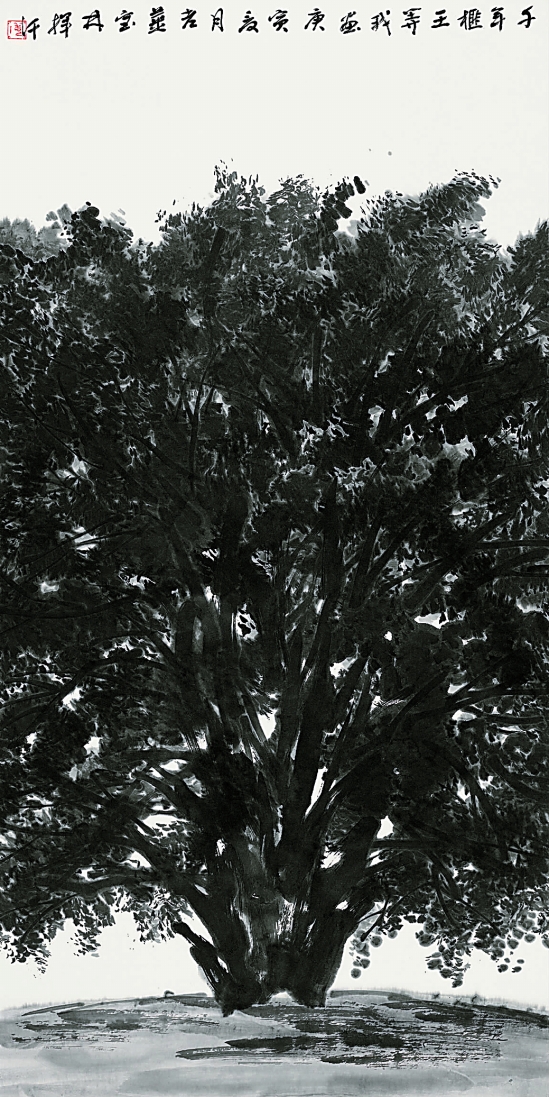 评者曰:余与宝林同游千年榧林,信口脱出“千年榧王待我来”之语,君据此为画题,深慨千余年来无人以此入画,舍我其谁!左右对称格局,自下而上则地、树、天与题字四段造型,所占比例与墨色浓淡不等,君真精于现代分割者也。