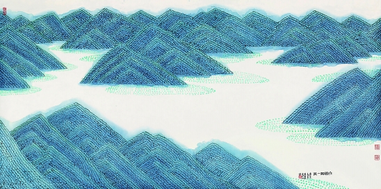 评者曰: 这画法不着色时叫“白描山水”,着了色就不知该怎么叫了,其实还是以白描为骨。据说那德国人特喜欢,莫非是洋玩意?最近我才知道,宝林是看了京剧舞台上龙袍下摆刺绣的山水顿悟得法,原是地地道道的祖宗法度。此画方法依旧,只不过加了些绿珍珠,那白塔湖就既美且富了。