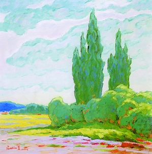 在他的油画风景、风俗画作品中,既能看到单纯、净化、洗练而和谐的色彩,简洁而整体的造型,又能见到融色、形、线于一体的绚丽多彩、富有装饰趣味的民俗气象与地域图景。这里虽可见西方印象主义及其后诸流派熏陶的一些痕迹,但更多的是对我们自己民族、民间艺术传统的吸纳,匠心独具,别具一格。