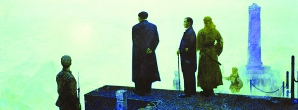 原来“儿子”就是他30年前创作的巨幅油画《历史的呼唤》(375×120cm原名:《啊!中国》,当年在上海美术馆举办的建党60周年画展中展出)。江白好生了得!30年前两岸关系不如现在,他敢于创作。画家以庄严、肃穆、沉静、凝重的蓝色为暗基调(油画技法上用暗色调中求层次,难度之大);中景是晨曦中的人民英雄纪念碑(象征着中国近代史);远景是朦胧中的祖国大地(并有一联串具有象征意义的希望之光);将中国近代史上重量级的三个代表人物毛泽东、孙中山、洪秀全都画成背(侧)影,(前苏联油画《前夜》有列宁背影,石鲁国画《转战陕北》有毛泽东的背影)。从他们各具特色的身影中显得更深沉,主人公各自的卫兵的安排以及完全虚拟的空间,富于戏剧性效果和神话色彩。可以说这幅作品是超前的预言,以现实主义的写实手法,又富象征性、诗情浪漫等多种流派的历史性油画。用跨越时空的手法组合在一个看来完全虚构的空间画面上,尤如加西亚·马尔克斯的魔幻现实主义的小说《百年孤独》,把历史上现代的、过去的人物放在一起对话。画中的孙中山面向毛泽东,仿佛在说“悄悄话”,又似乎在探讨着某些问题而显得若有所思……