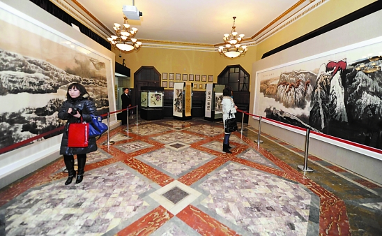 天津文化艺术品交易所在中国金融博物馆举行艺术品份额发行上市路演时,展出的《黄河咆啸》(左)和《燕塞秋》(右)。