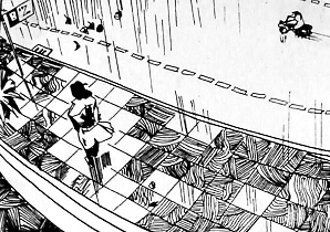 斜视效果的构图,由于表现的物象整体结构与画面框架有倾斜关系,给人以在歪斜的航船上看东西一样,有晃动和极不稳定感。见图蒋跃的《最后的谢幕》连环画中一组用不同的视点和角度,斜视的画面使构图变化得生动,并从中揭示和暗示出画面人物的内心活动。