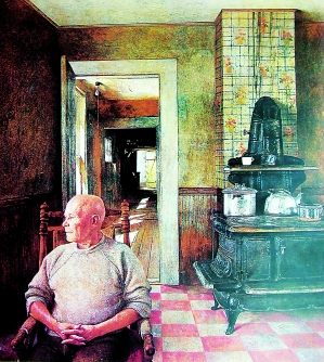 我们前面说过,透视的发现,成为十五世纪意大利绘画的主要特点。画家马萨卓等人以光学和数学为基础,建立起关于适应观众位置的成像法。一切描绘物都与人的视点相适应,意味着人更进一步接近周围的世界。见图,美国画家怀斯的作品《艾里克森》,画面上有好几扇打开的门,层层叠叠,作者利用透视把空间感表现得很好,引人入胜。