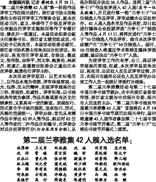 本次活动评审原则:以艺术标准至上、以作品水准为依据,评审体现客观、公允、包容、民主的精神,实现评审结果的公正性、客观性、权威性。评审标准:以书法经典传统为参照,作品风格既要有历史的继承性,又要具有一定的新意。表现技巧、形式要合乎书法的规范,追求技巧、形式、风格的完美统一。评审办法:首先从来稿作品中评出62件入围作品,然后对62位入围作者的二件作品分别编号,由评委会对其分别评审打分(打分采用百分制),从高分到低分决出36人作品。连同上届“兰亭七子”作品免评进入42人展(其中一位未投稿),并且进行第一轮“兰亭七子”10位候选人作品评审,评审成绩由公证处封存。42人展入选名单及作品另附,即日起进行媒体公众投票评选“兰亭七子”候选入围作品,4月17日,将再次进行“兰亭七子”10位候选人作品评审,结合本次评审成绩产生“兰亭七子”10位候选人。届时,10位候选人将通过学术答辩及媒体评选成绩,最后决出“兰亭七子”人选。