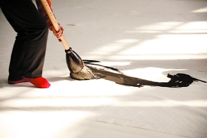 其书大,不仅是篇幅如一片天空,让观者在广大的白中散我心怀,而且是书者将吞吐八荒的气概,融化在春天无形的柔软里,神形纸面,如风一般悄无声息。没有了《逍遥游》里的狂放,没有了进行极致的艺术对比的书写。那位平时紧张的伟大书写的追求者消失了,转而是一位朴素诚恳的艺术家,默默而行,在密集的围观人群里,他如同忘怀了观众众多的对象,以书法的无相的抽象线条,尽情于表现《心经》的无相无得的智慧。