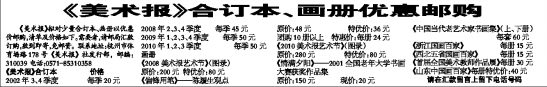 《美术报》拟对少量合订本、画册以优惠价邮购,清单及价格如下。需要者,请邮局汇款订购,款到即寄,免邮资。联系地址:杭州市体育场路178号《美术报》社发行部,邮编:310039 电话:0571-85310358