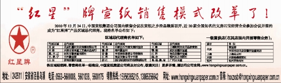 2010年12月24日,中国宣纸集团公司国内销售会议在宣纸之乡泾县隆重召开,近20家全国知名的文房四宝经营企业参加会议并签约成为“红星牌”产品区域总代理商。现将名单公布如下: