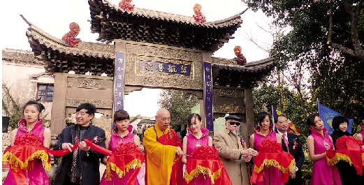 2010年中国第一座铜牌坊由朱炳仁主持设计落户于普陀山,图为朱炳仁和国学大师文怀沙(右5)、普陀山全山方太道慈(左4)、普陀山风景名胜景区管委会书记蒋宝华(右3)、香港美术学院院长徐燕婷(右1)参加揭幕仪式